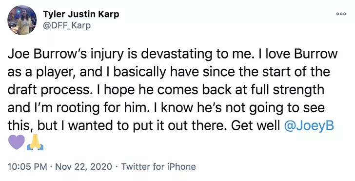 Cincinnati Bengals quarterback Joe Burrow suffered a season-ending left knee injury during the team’s Nov. 22 game against the Washington Football Team.